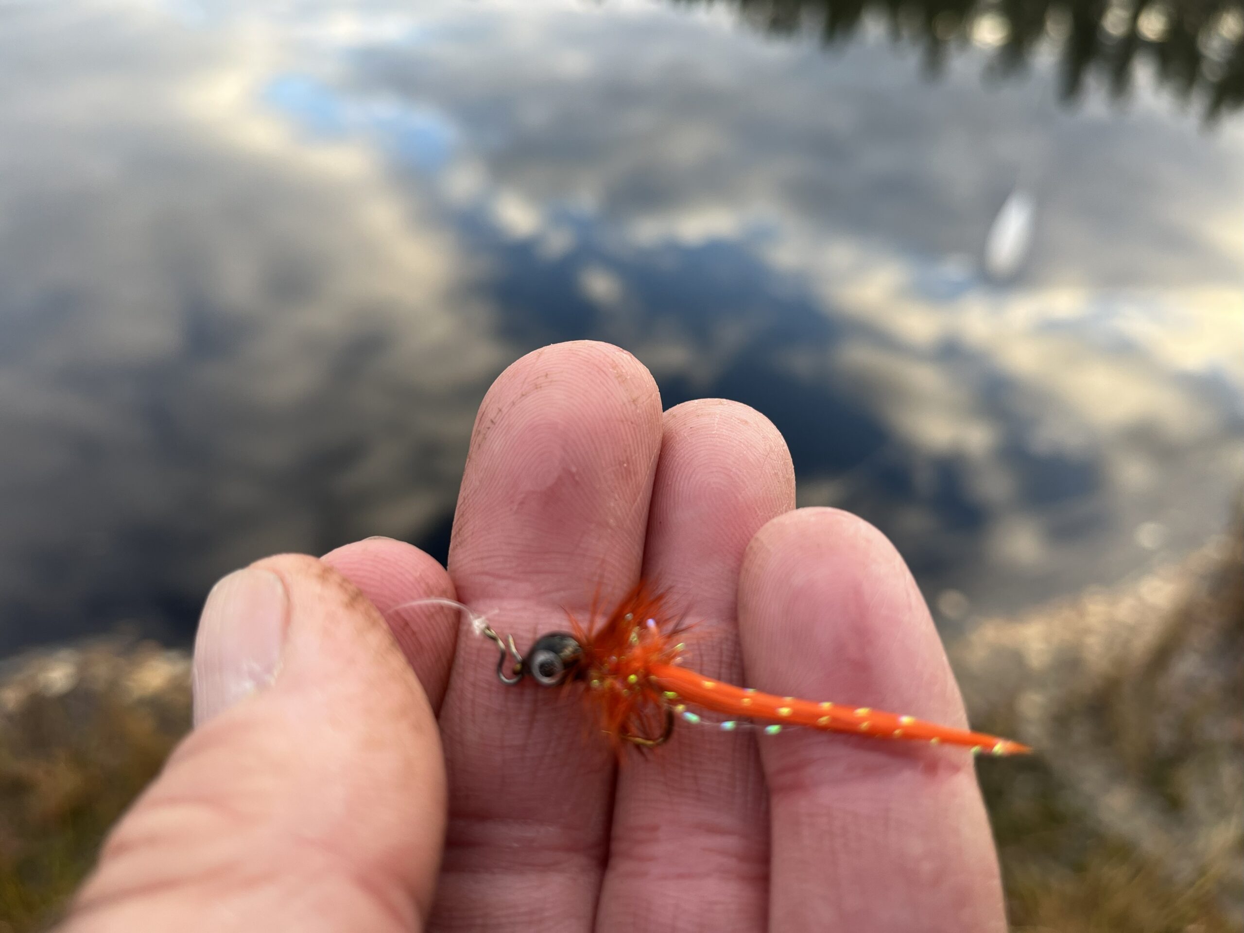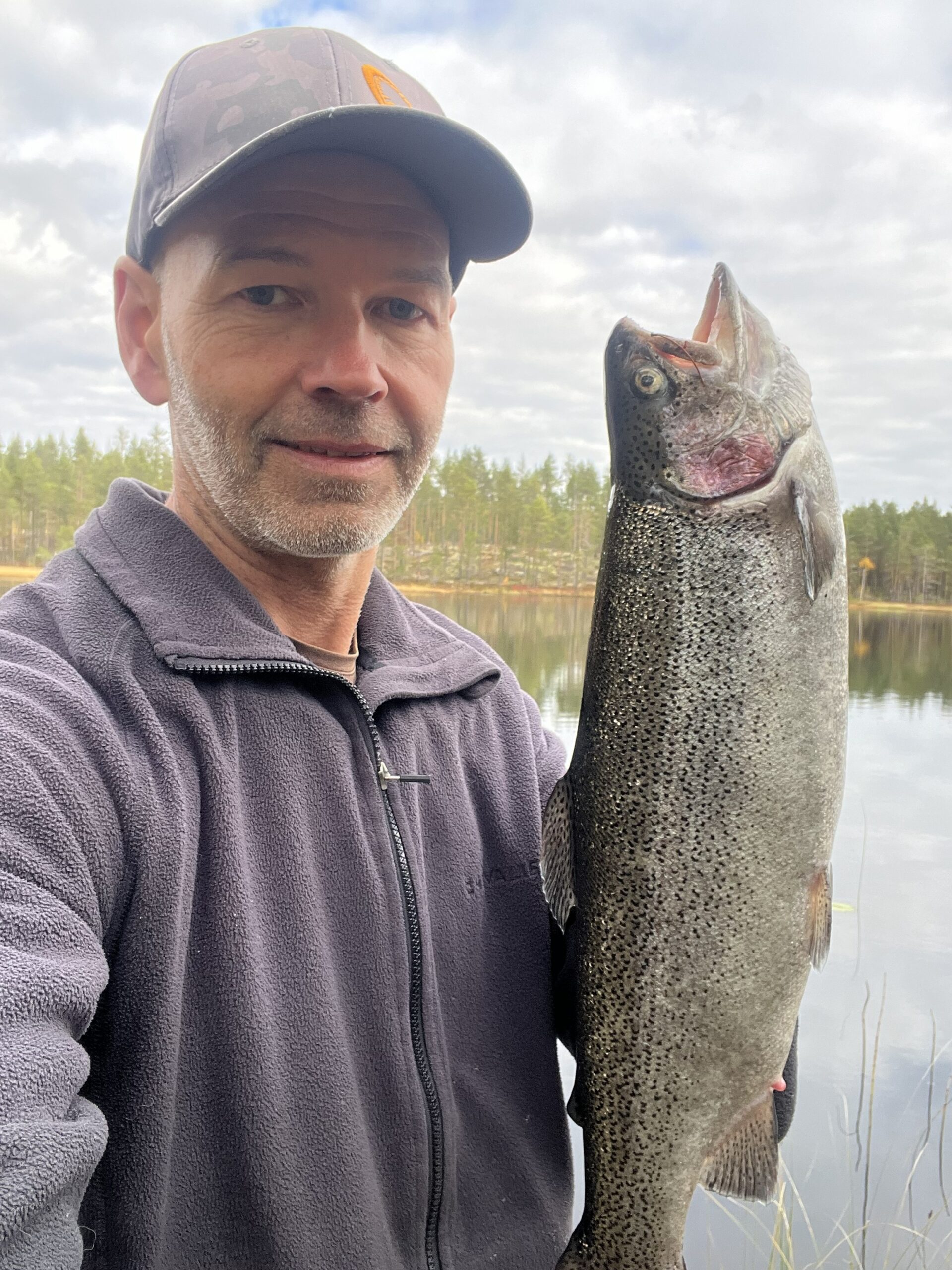 Bytte efter ett tag till bombardatackel med en orange Swim bugger och det gav utdelning. En fin regnbåge på 1,6 kg. Perfekt middag, och vad gott den smakade! Här är det friskt och klart vatten som påminner om en fjällsjö vilket speglar sig i hur fisken smakar.