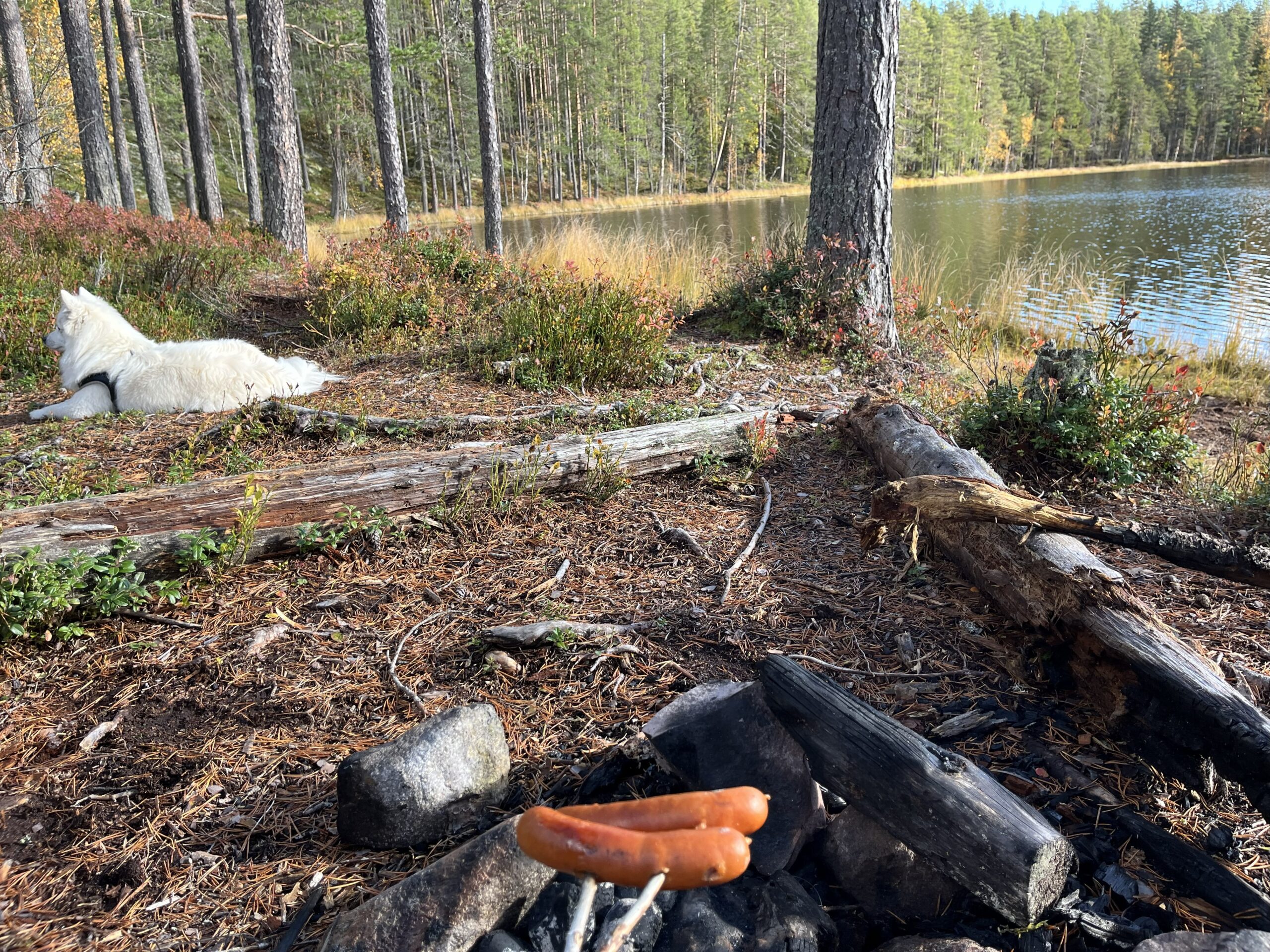 Tände en brasa och grillade korv. Tyckte att korvbrödet var torrt och trist så det slängdes i sjön. Efter 10 sekunder plaskade det till och korvbrödet slukades av en fisk. ”En knäpp regnbåge” var tanken, men fisken som cirkulerade runt bland brödsmulorna nära land visade sig vara en röding!