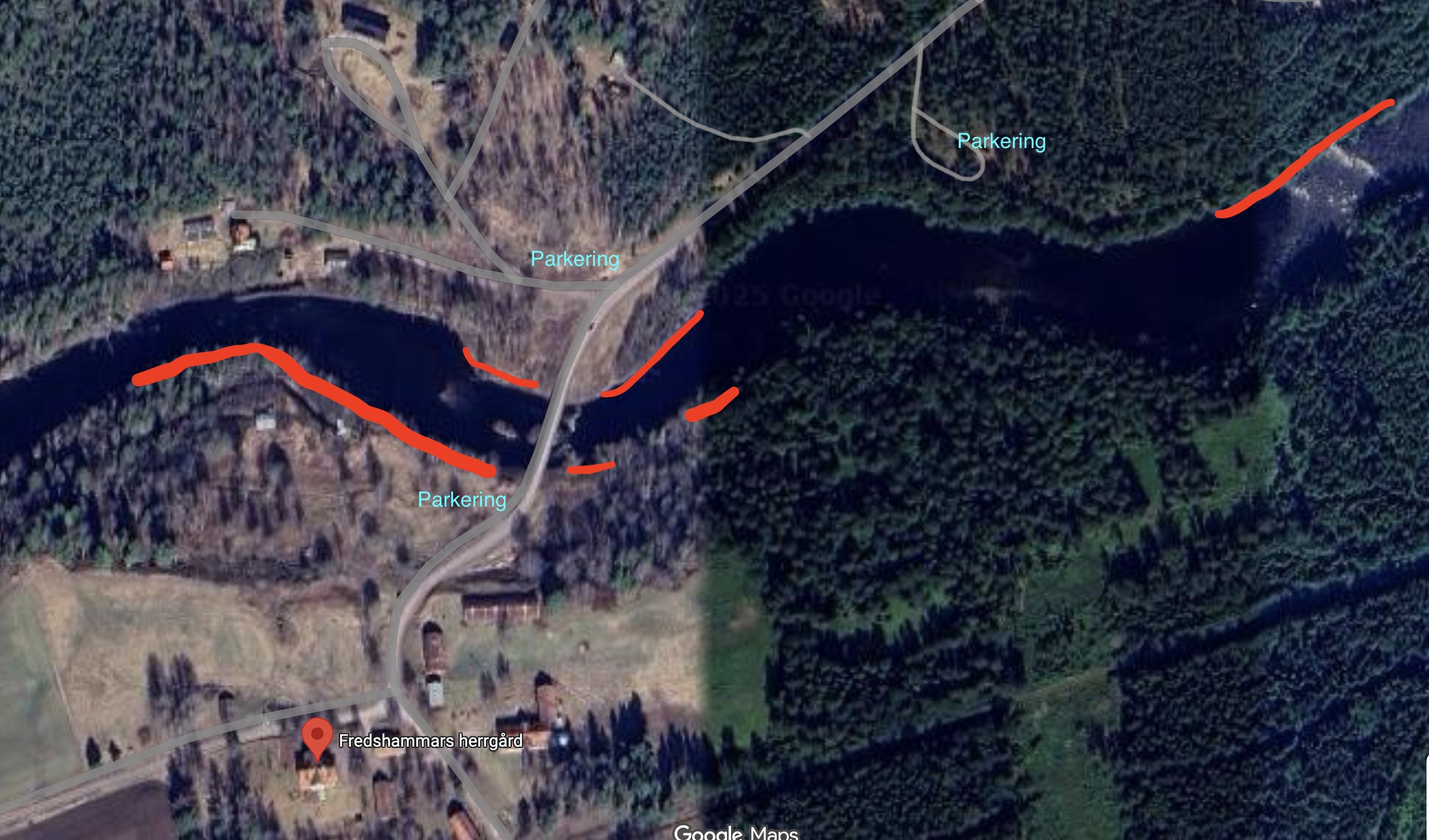 Du kan gå nedströms från bron på älvens södra sida ett hundratal meter tills det blir lugnare vatten. Flugfiske funkar men är inte optimalt eftersom skogen är nära.
