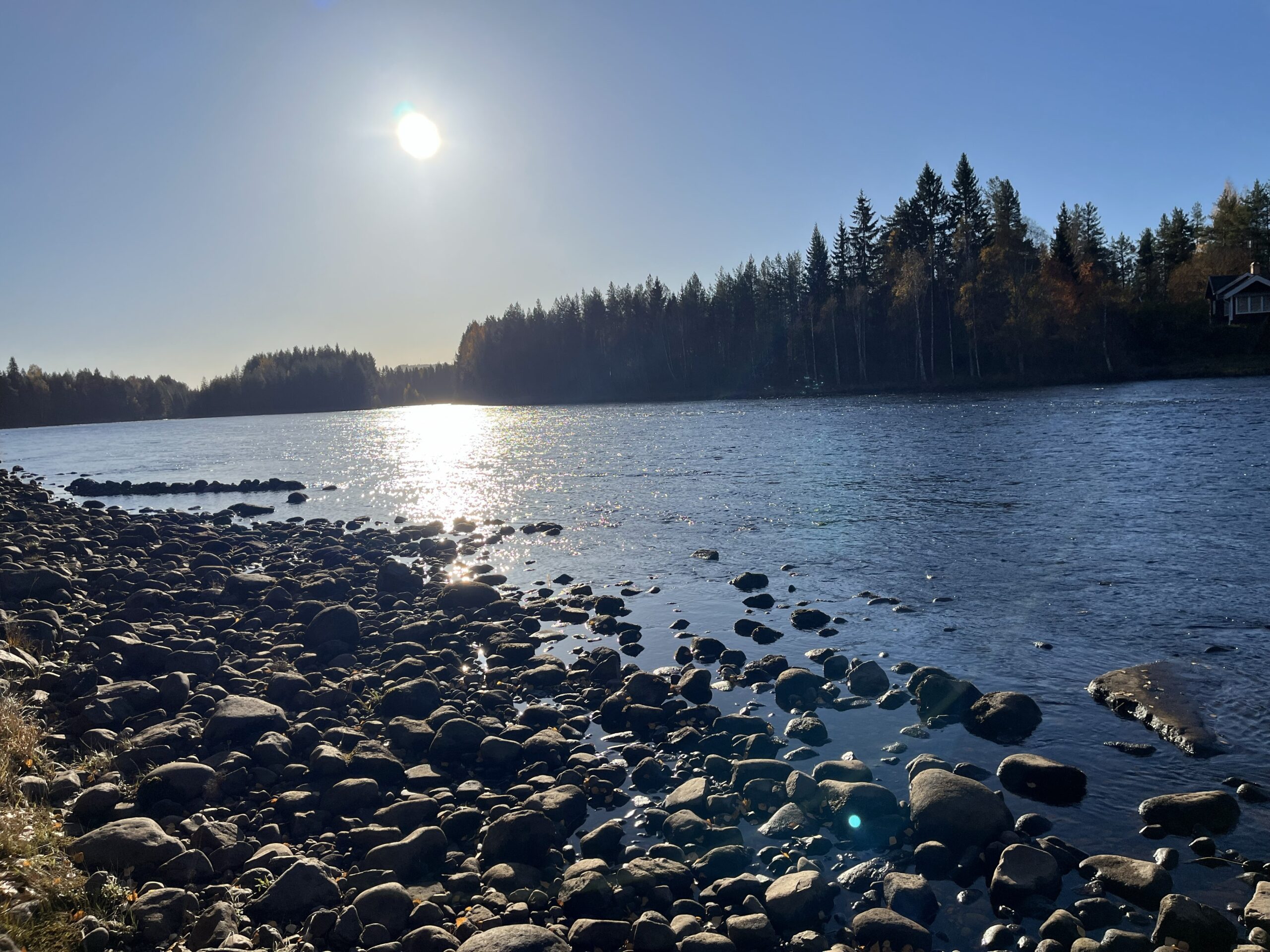 En bit nedströms finns grunda partier på bara ett par decicmeter med starkt strömmande vatten. Där skymtades ryggfenor på fina harrar, så väl värt att placera flugan där. Fortsätter man vidare så kommer man till bergshällar med lite djupare vatten. Där har man dock väg 70 precis bakom ryggen vilket begränsar naturupplevelsen.