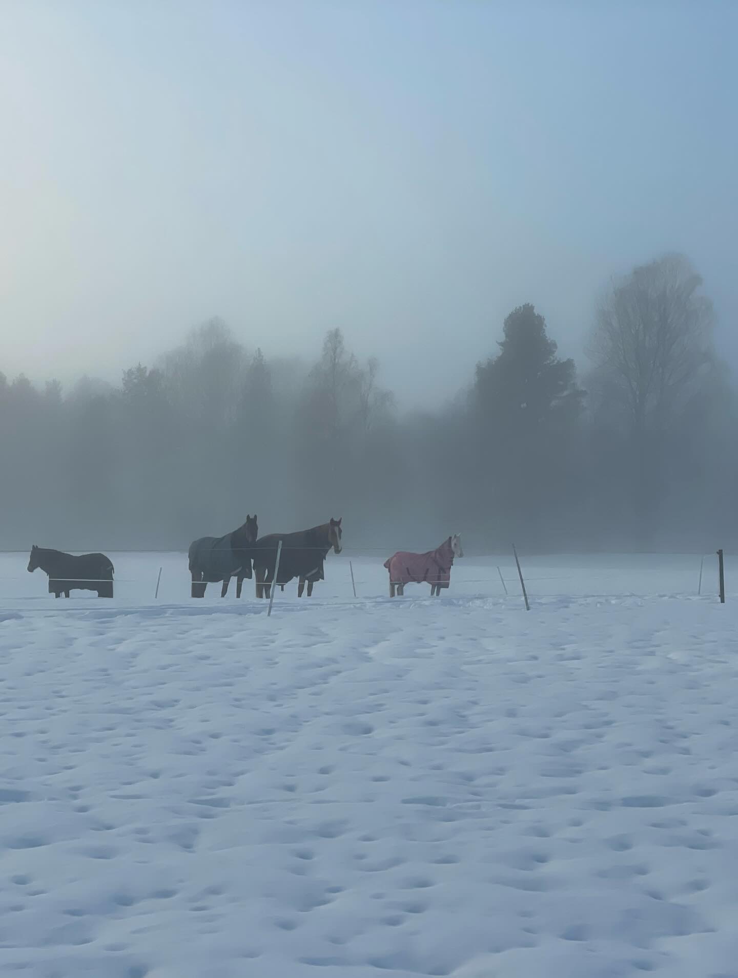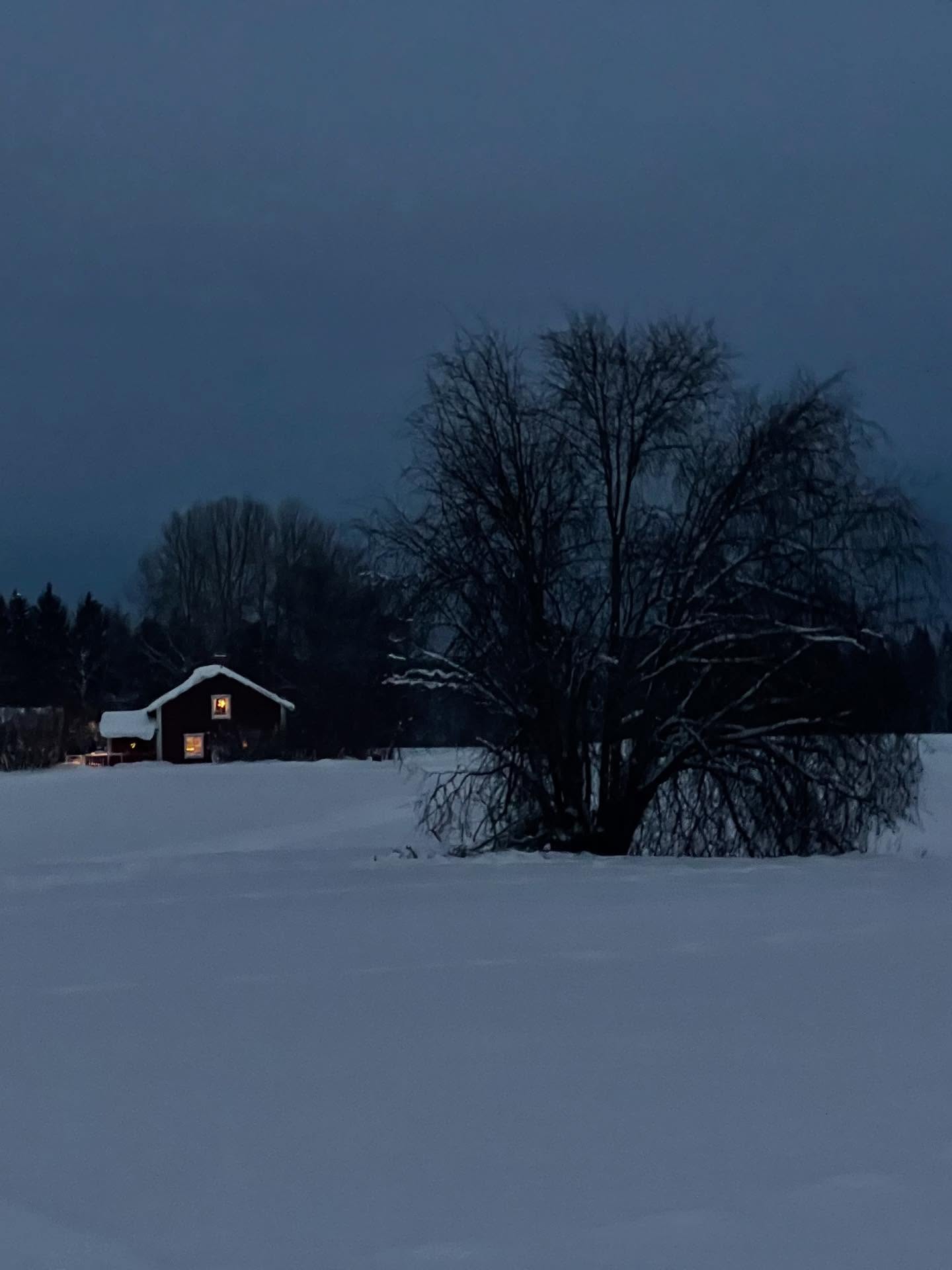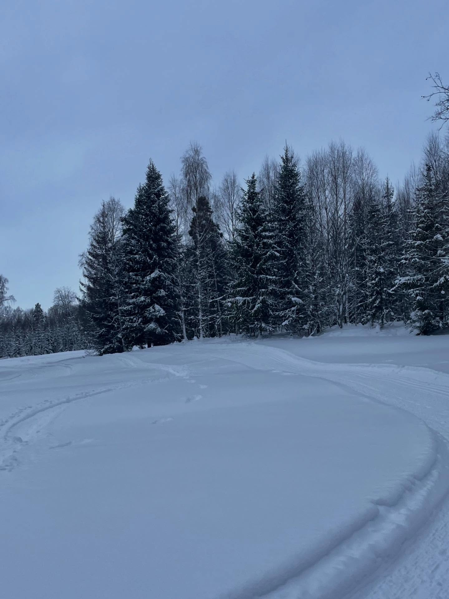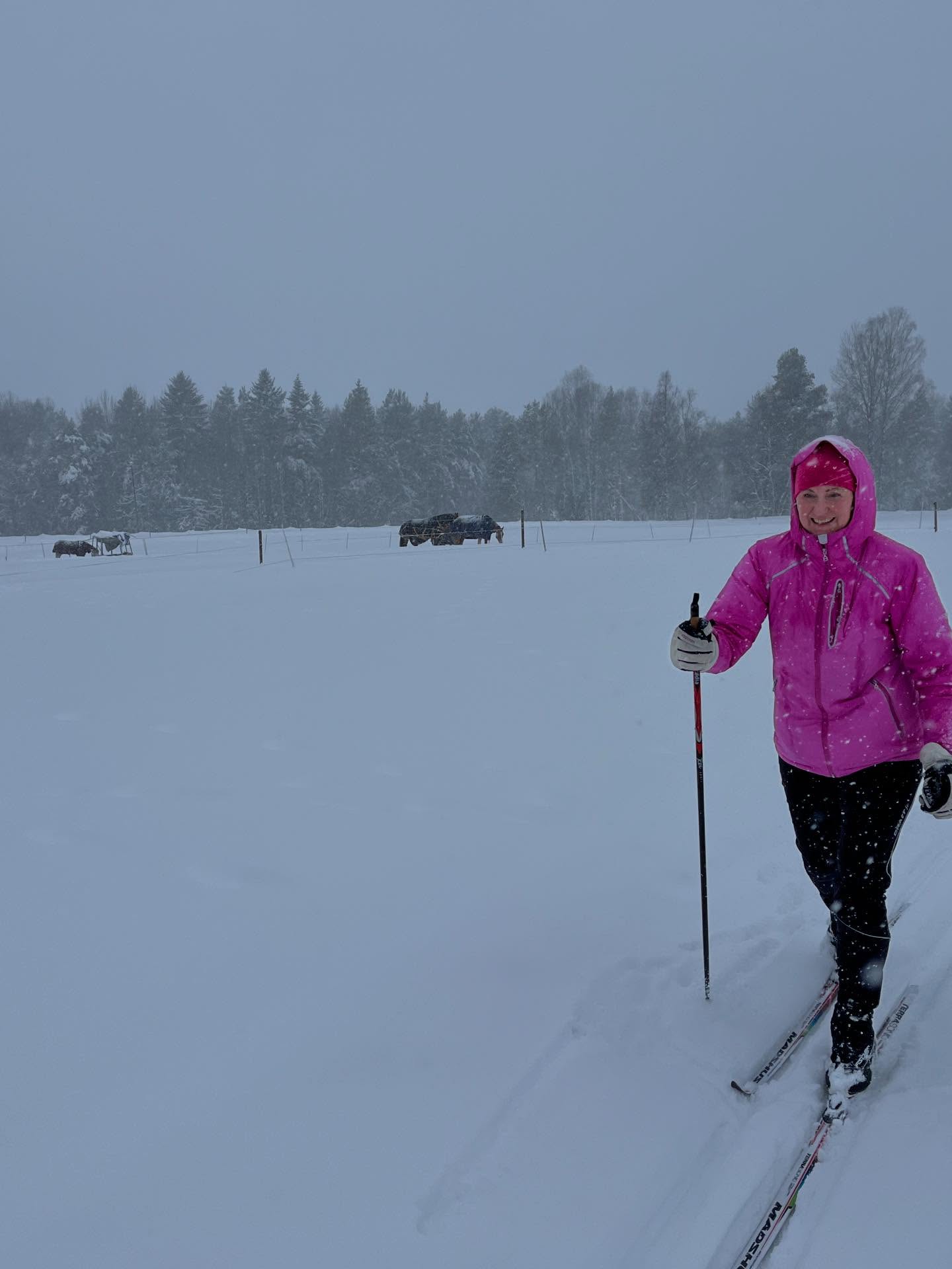 Ena dagen hann vi ut under sen eftermiddag/skymningstid med mulet väder så bilderna blev lite mörka. En annan dag hade det dunsat ner en massa nysnö så spåren var helt översnöade, men ett par entusiastiska skidåkare hade varit ute före oss så man kunde följa deras spår. Det var då ganska tungt att åka, men vi körde ändå ett par varv ändå och hästarna invid Boggvägen blir alltid lika glada och nyfikna när vi ”susar” förbi (i snigelfart).