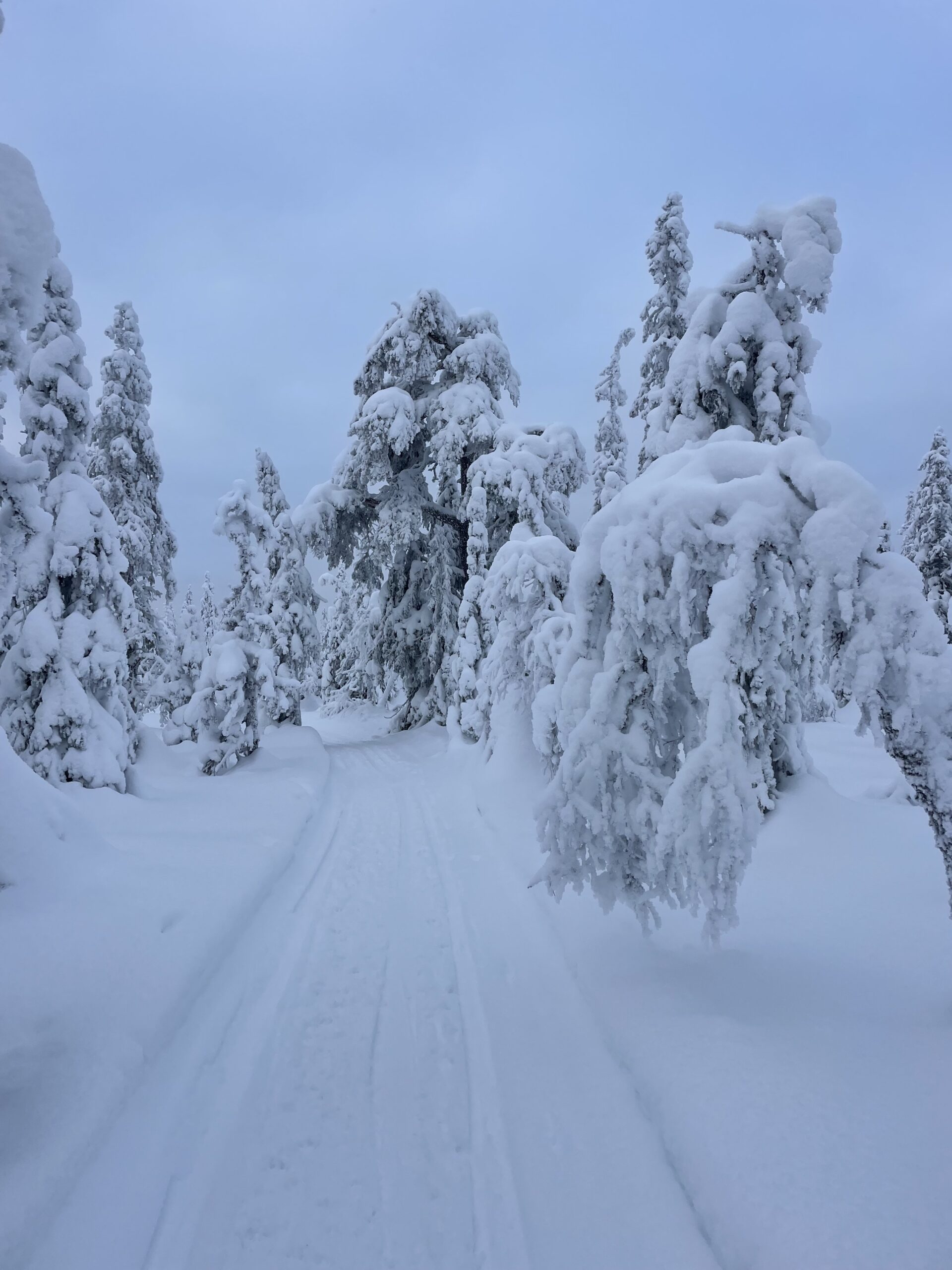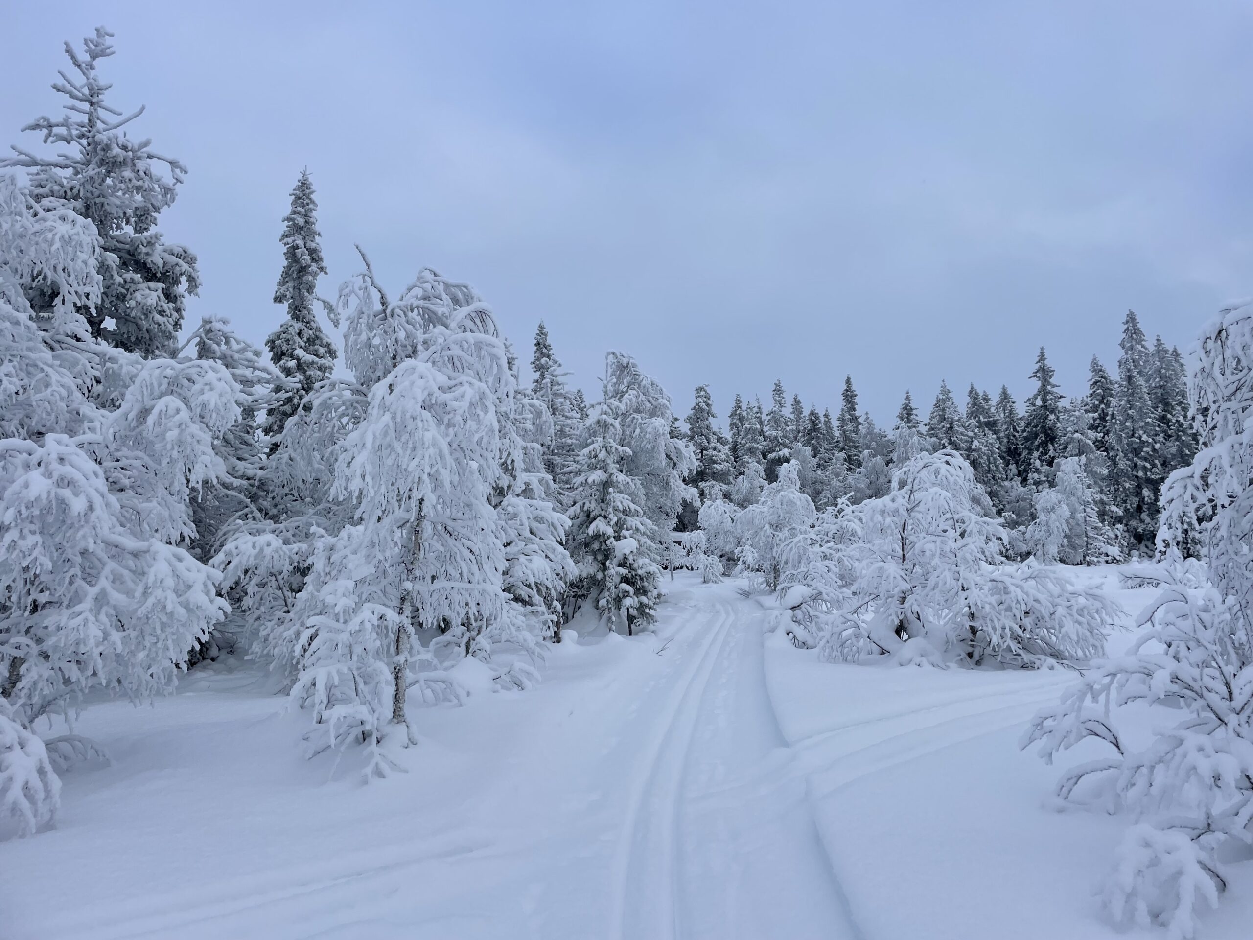 Eftersom det inte är uppkörda spår är det allra bäst att ha turskidor, men vi har själva åkt med vanliga löparskidor – man får bara jobba lite hårdare!