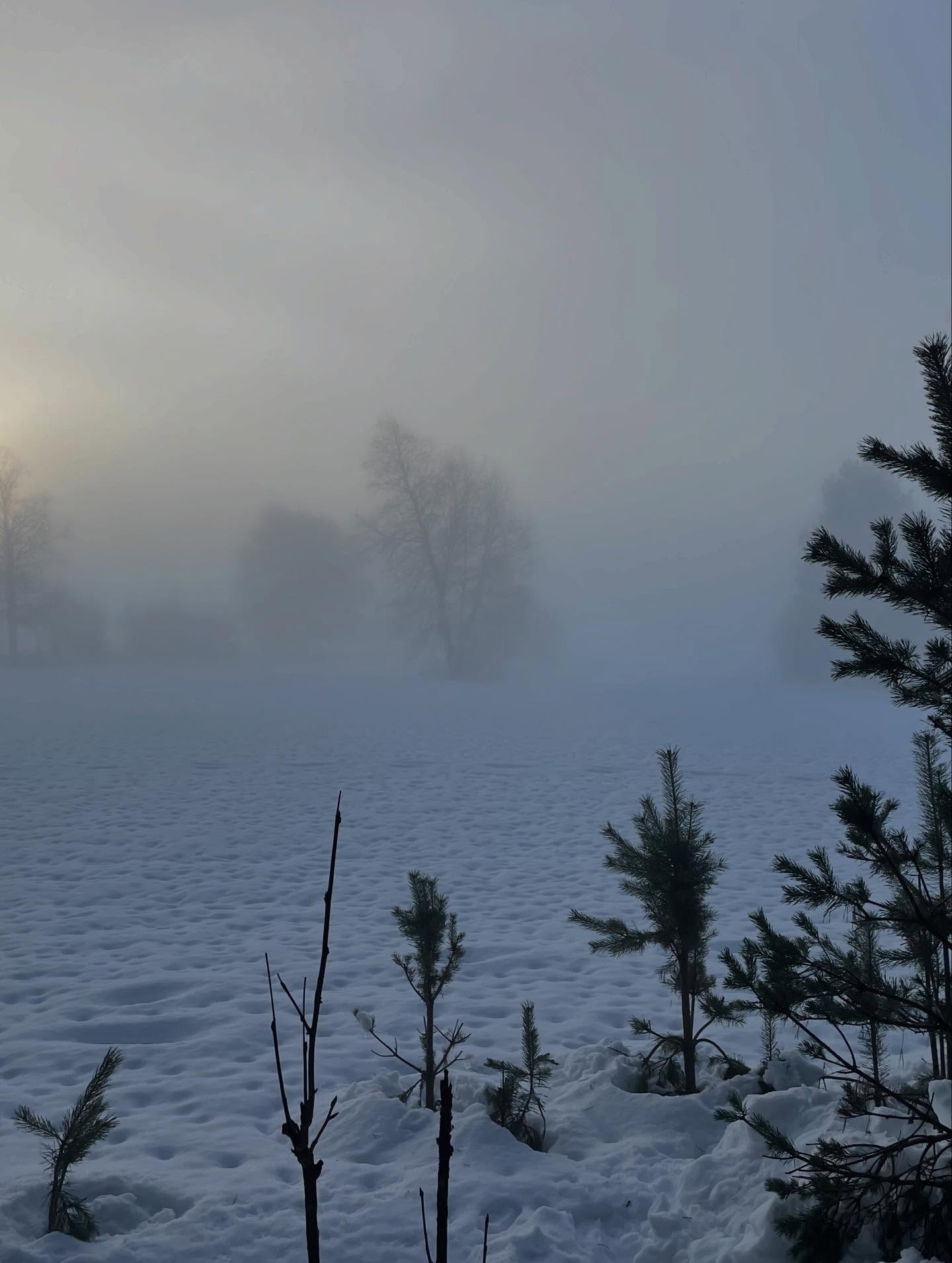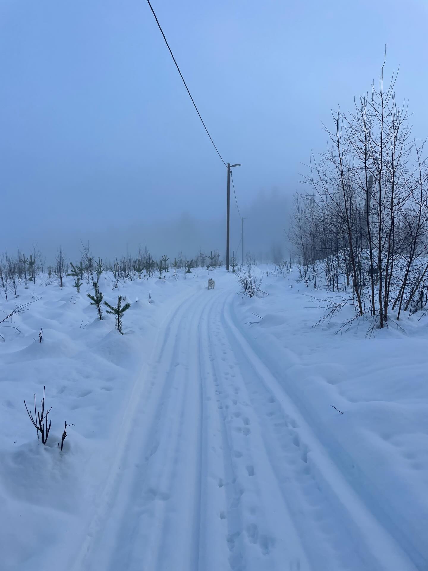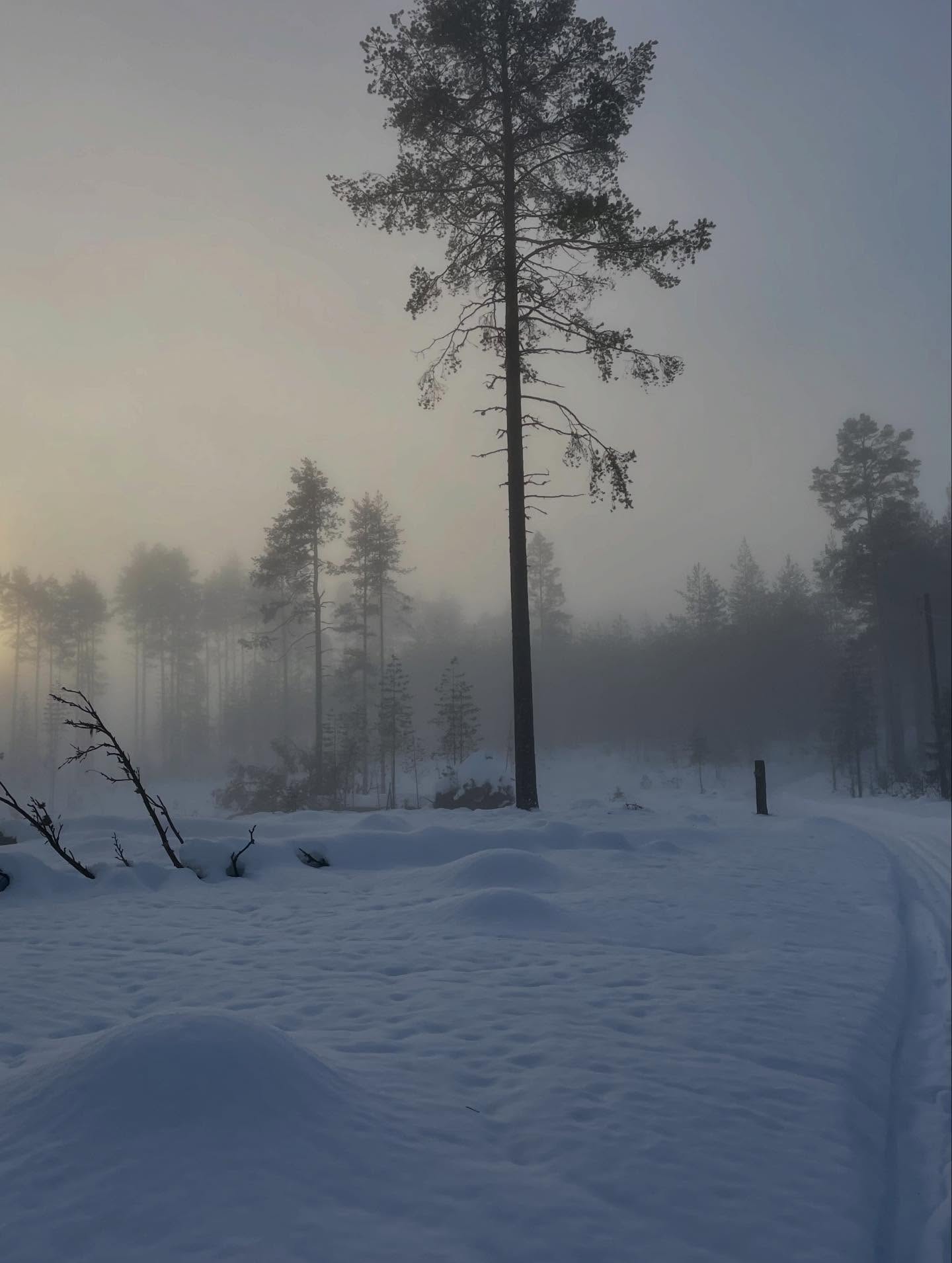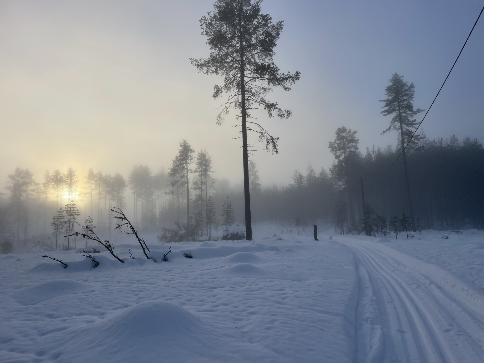 Dimman låg tät och solen kämpade för att spricka igenom här och där. Turen gick mestadels genom tallskog och ingen snö låg kvar på träden här tyvärr och snön hade  sjunkit ihop lite p g a töväder dagen innan. I stället för det mjuka, lätta fluffiga duntäcket som vi hade ett par dagar innan var nu snön tung och skarhård.