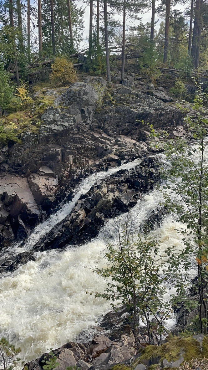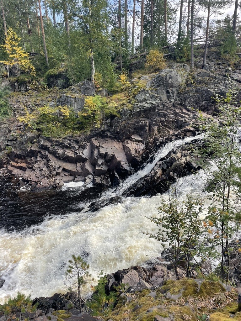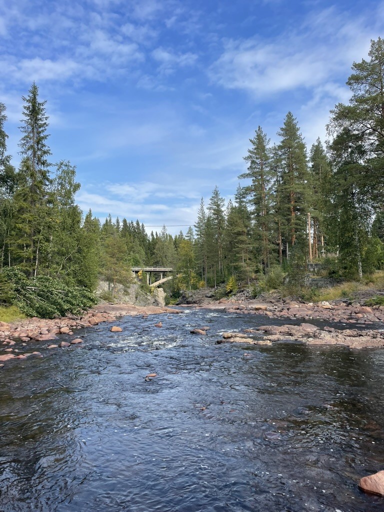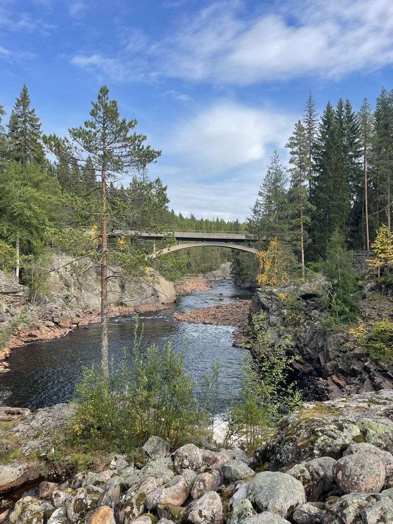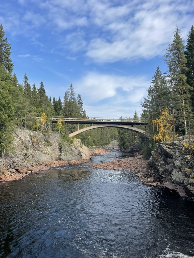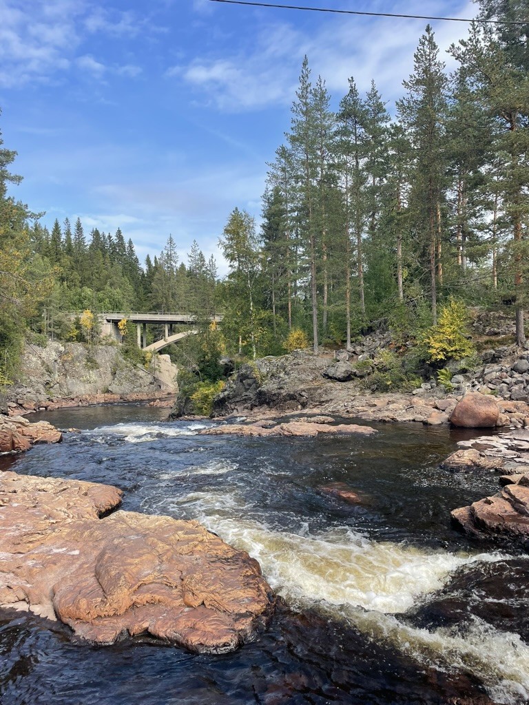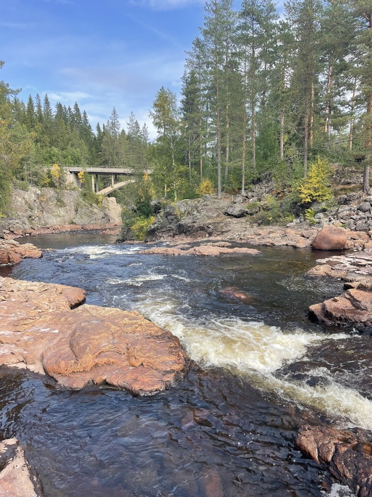 Namnet kommer från finskan och betyder ungefär ”knoppforsen”. Forsen i Oreälven är platsens stora kännetecken, och särskilt under vårfloden är den väldigt mäktig. Kör in till vänster och parkera så kan du klättra ned och titta på den mäktiga forsen!