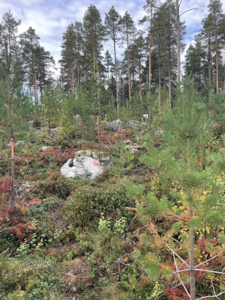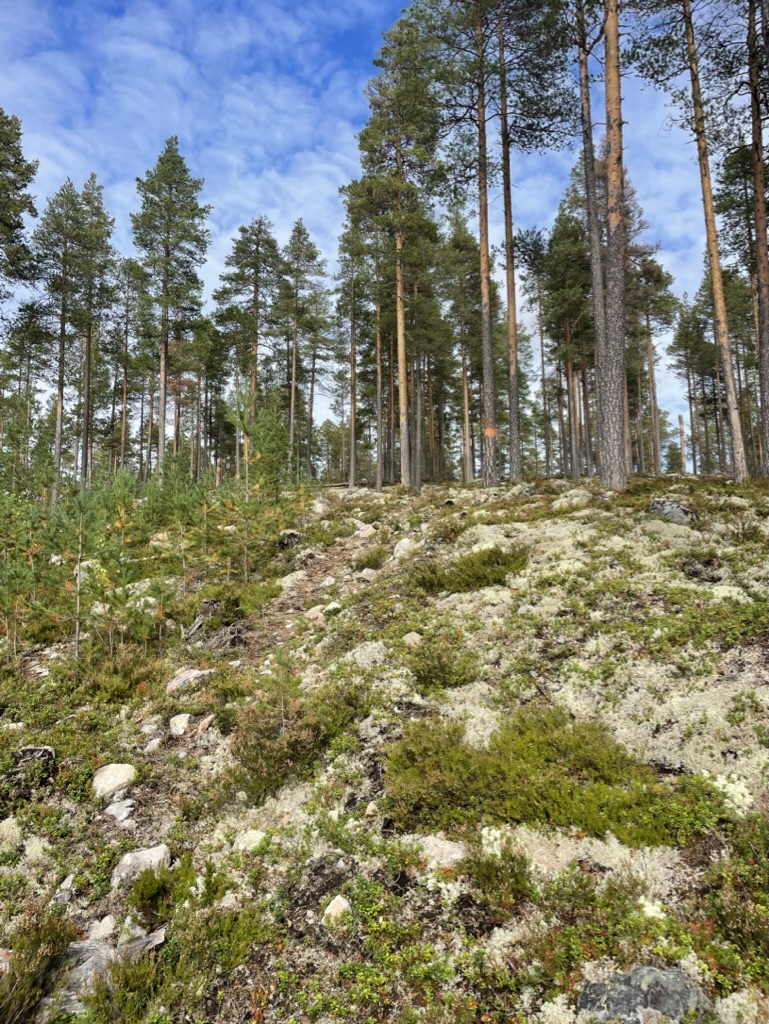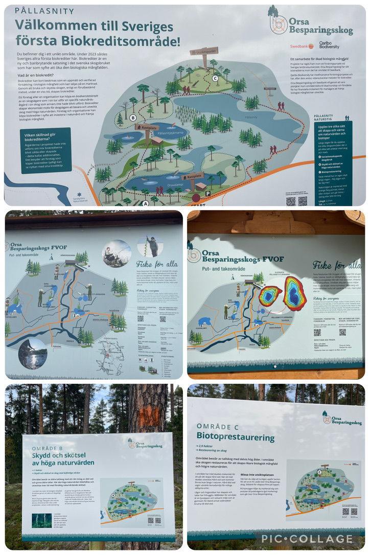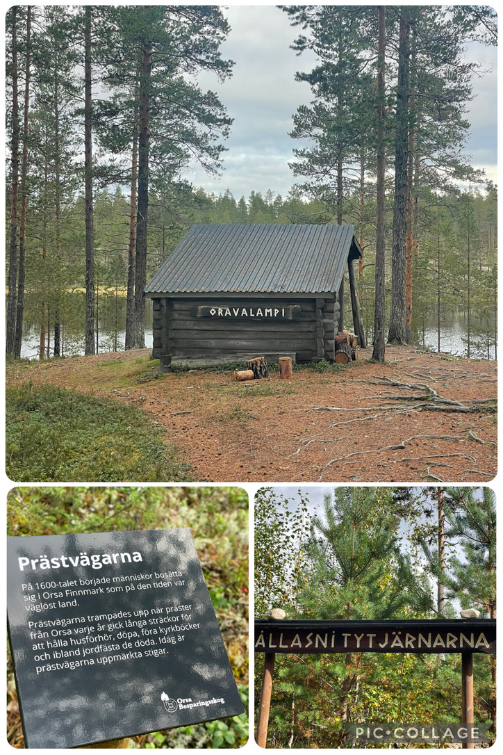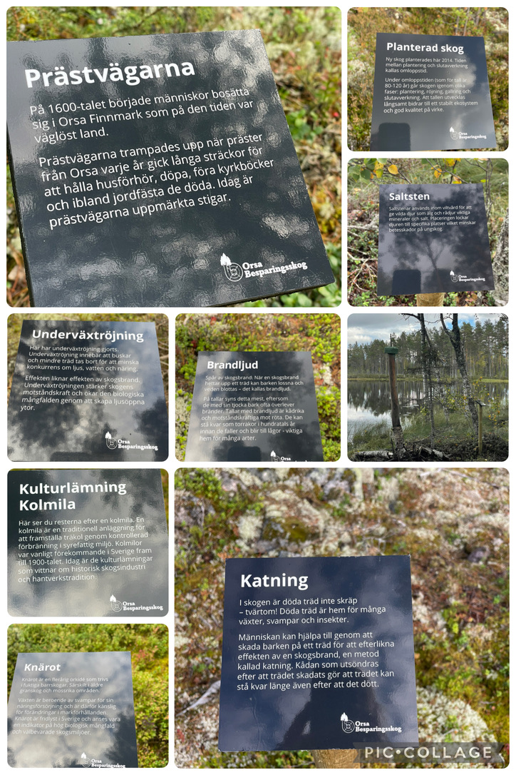 Vi var här i mitten av september, när hösten precis börjat färga landskapet, och gav oss ut på en vandring på cirka 4 km. Marken som leder genom området förvaltas av Orsa Besparingsskog, och det märks tydligt hur väl omhändertaget allt är. Lederna är markerade med orange färg och här och där finns infotavlor som gör att man inte bara rör sig genom naturen utan också lär känna den.