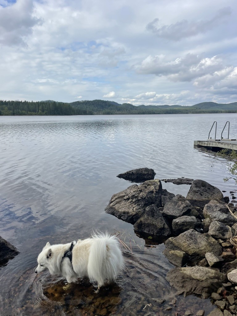 Det finns självklart parkering, vindskydd och dass och badstrand. Ta en promenad ut på den vackra åsen som ligger som en halvö ut i sjön.