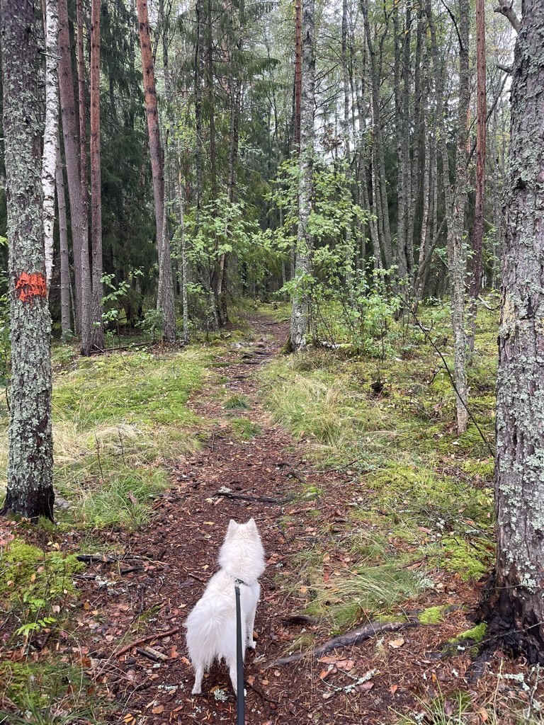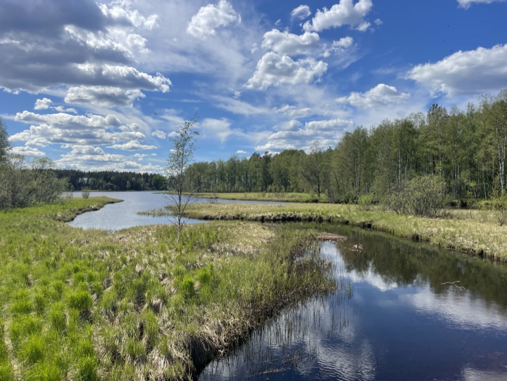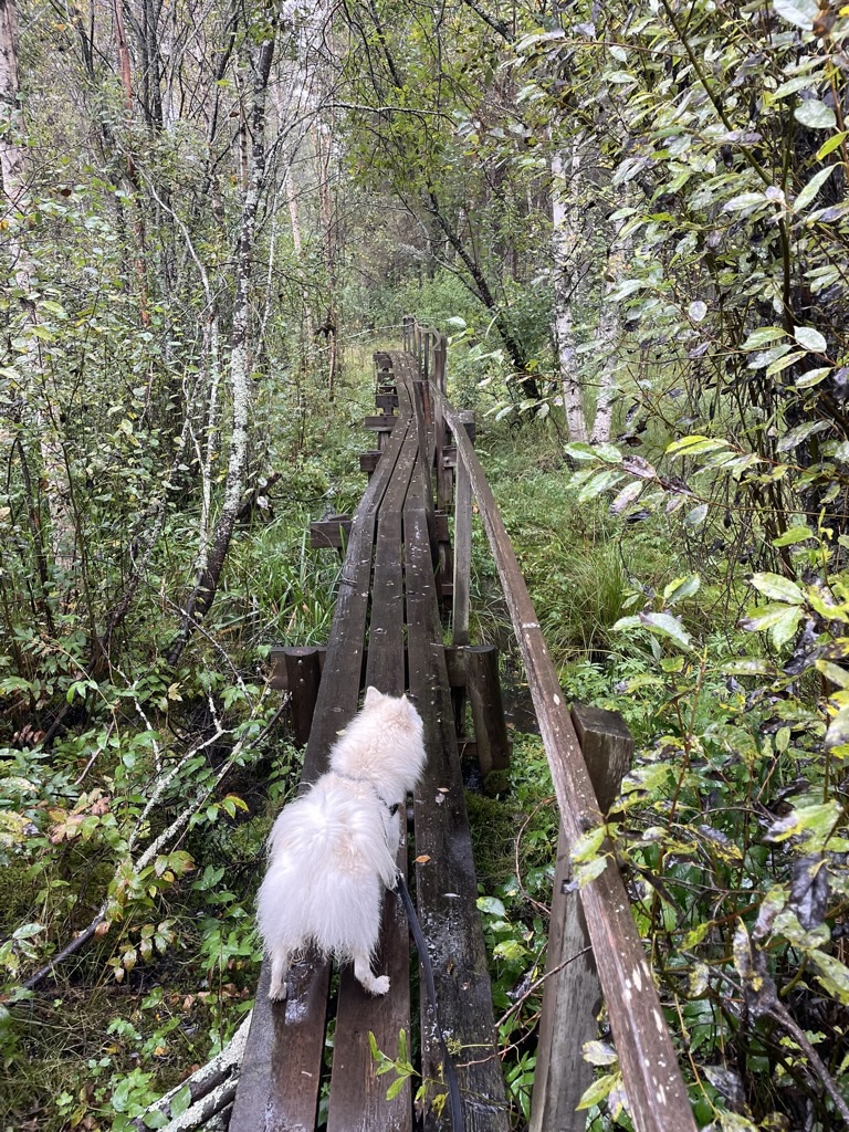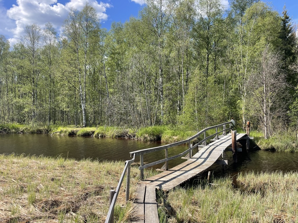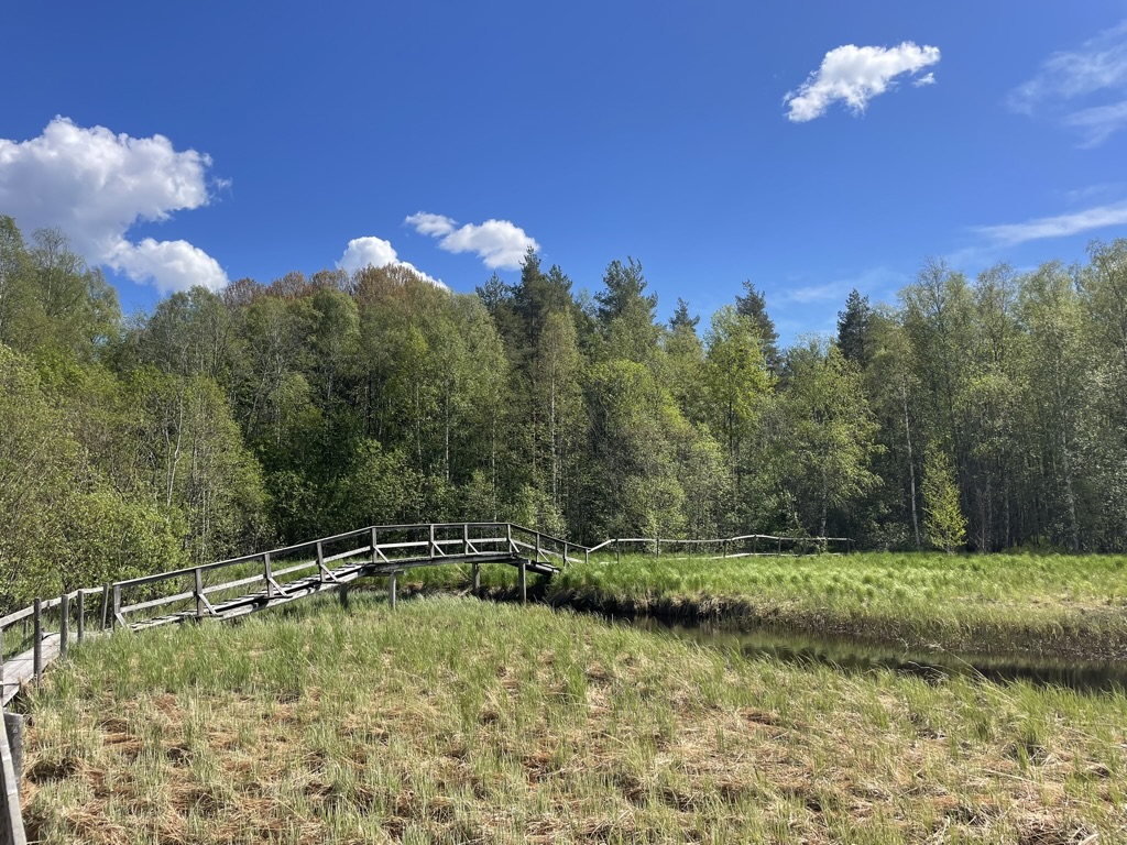 Stigen fortsätter genom ett skiftande landskap. Du korsar små åar och våtmarker på långa träbroar som slingrar sig fram mellan tuvor och vass. Runt omkring dig porlar vattnet, och ibland glimtar sjön till mellan trädstammarna. Det är en vandring som väcker alla sinnen – ljudet av fåglar, doften av fuktig jord, känslan av vinden mot huden.