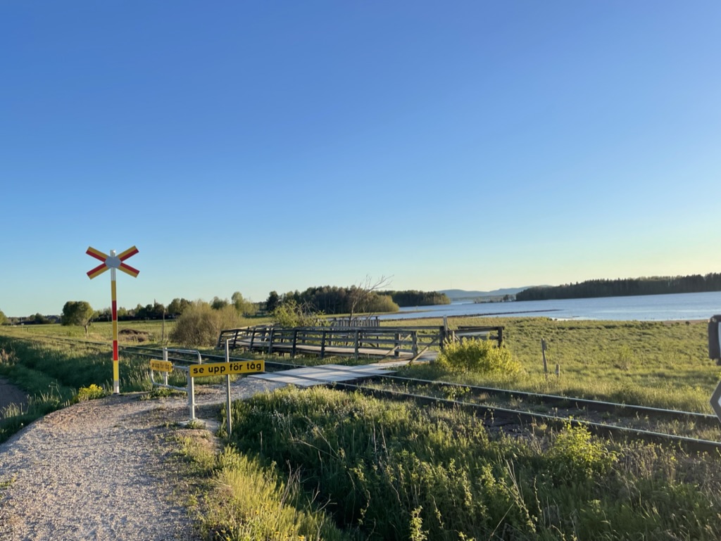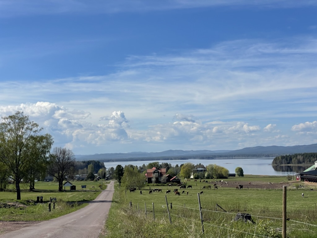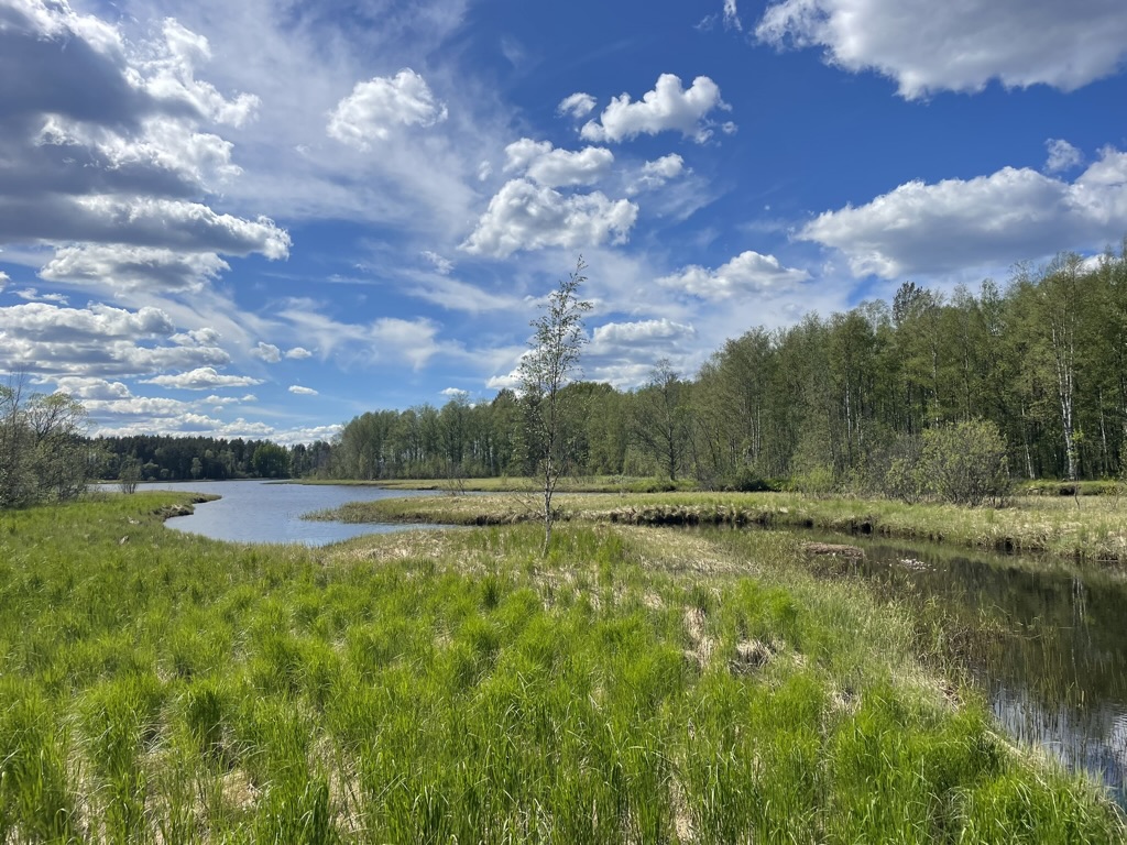 Vandringen fortsätter söderut, där stigen leder ut på de öppna strandängarna. Här ligger den stora fågelplattformen, mitt i det lantliga kulturlandskapet. Från plattformen har du utsikt över betande kor som lugnt rör sig över ängarna, röda gårdar och små stugor som glimmar i solen, och det blå Orsasjövattnet som möter horisonten. Det är en plats för stillhet, reflektion och förundran – där naturens skönhet får tala för sig själv.