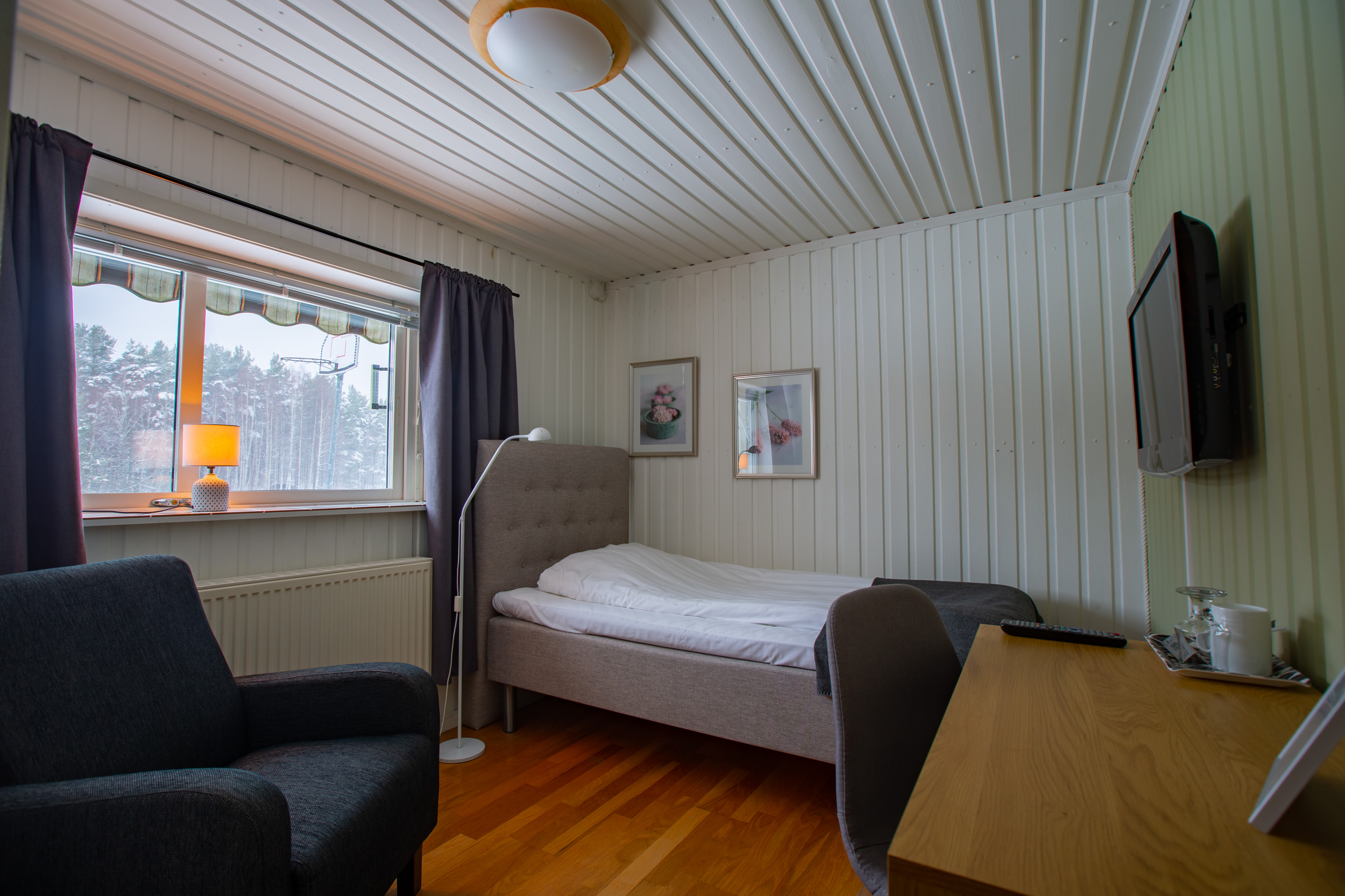 Samtliga enkelrum har skrivbord, fåtölj, tv, vattenkokare och eget badrum med dusch och wc.